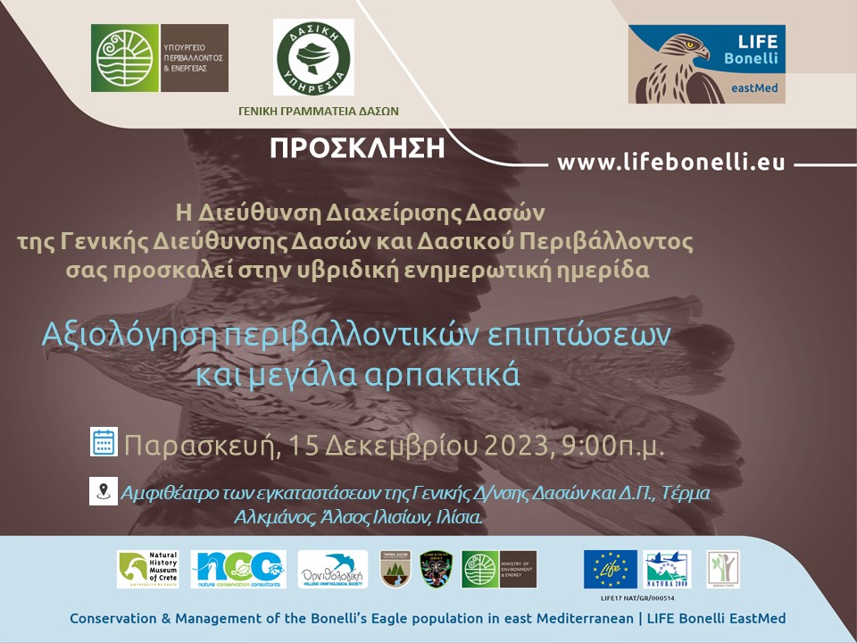 Υβριδική ενημερωτική ημερίδα του έργου LIFE Bonelli eastMed: "Αξιολόγηση περιβαλλοντικών επιπτώσεων και μεγάλα αρπακτικά" on 13 Δεκεμβρίου 2023